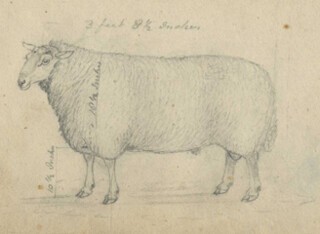 The next page contains draft lettering for an engraved broadside, A Comparative View of Two Cheviot Rams, dedicated to the honorary members of the Society for the Improvement of Cheviot Sheep. In the printed broadside, the prized ram is compared with a scrawnier creature with spindlier legs, and both are placed along ruled lines of scale, in order to show the changes made to Cheviots by the stockbreeder Thomas Smith. Another page in the sketchbook is given over to a preparatory drawing for Smith’s ‘stud card’, in which the engraved image of Whitham, the ram, served as a kind of business card.