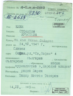 Born in Sliven in 1941, Kristeva was first taught French by Dominican nuns in a Catholic convent. After they were expelled from Bulgaria on suspicion of espionage, she was transferred to a secular French school (the English school was open only to the children of party members). She graduated from Sofia University at the top of her class, was active in youth organisations and worked as a journalist for several publications including Narodna Mladej. In 1965 she was authorised to go to Paris to study for one year. But she stayed longer and in 1967 married Philippe Sollers. In 1970, according to a report in her ‘Personal’ file by agent ‘Petrov’, following a successful ‘recruitment talk’ she was added to the ‘agent apparatus’ under the alias ‘Sabina’.