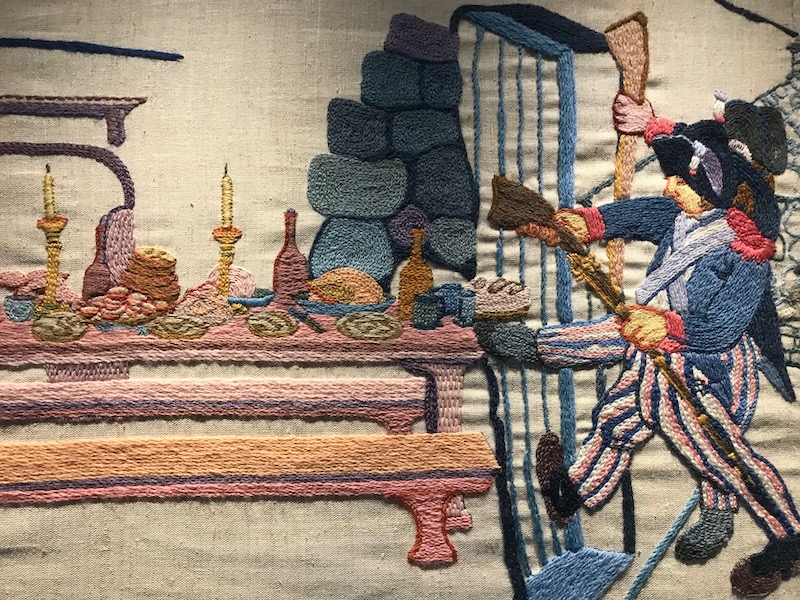 She went out to sketch the landscape and landmarks, ‘mostly in sunshine with gorse bushes in flower and smelling of honey’, and then began her task in earnest, drawing cartoons, first at quarter and then full size. These were then traced onto the stretched cloth for the stitchers to begin work. Cramp admired David Jones’s paintings and their intricacy comes together with her taste for the idiosyncratic to glorious effect. Her adviser on local history suggested she avoid myths, but she ‘tactfully forgot’ that guidance.
