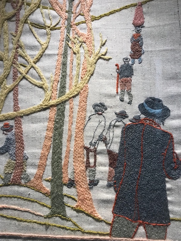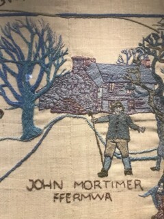 Colour matching, with Appleton’s vast range of crewel wools, was arduous but the grading and shading of tone, a broad-brush sense of rising drama (hot colours) set in a stony, pastoral landscape (cool colours) is one of the many glories of the work. It could be uncomfortable. One stitcher’s husband queried the green flesh-tones of a terrified French soldier, another was unhappy about an apparently purple horse. Allied to tone is texture, created by different kinds of stitch: nubbly tweed, variations of tree bark, boulder-built farmhouse walls. As at Bayeux, lettering (in Welsh and English) supplies dates, locations, identities.