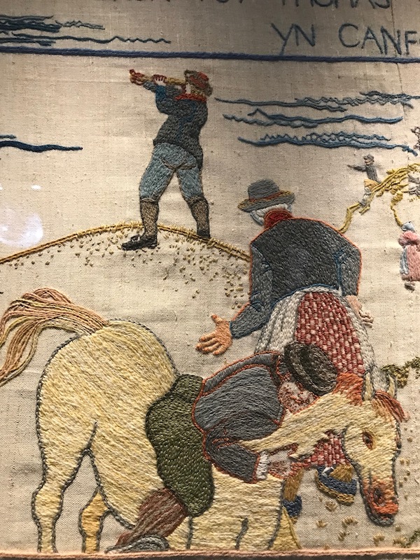 For the bicentenary in 1997, the Fishguard Arts Society made a tapestry on the model of the one in Bayeux. With scintillating detail and remarkable wit, the embroidery – thirty metres long and stitched by more than seventy local women – interweaves the stories told by the locals with those of the invaders.