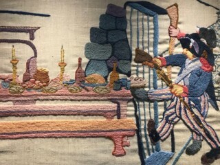 The presiding genius was a local artist, Elizabeth Cramp RWS, working with a team of three who guided the volunteers, aged from thirty to eighty, in the weeks, months and years it would take. In her own account of the process, she described how she had begun with details. Were Welsh Blacks already grazing the fields of West Wales in 1797? She found a ninety-year-old man whose grandfather spoke of red ‘Rowan’ cattle. She researched building materials and techniques, uniforms, horse harnesses, rigging (of the French ships), farm kitchens and more. Then she scripted forty scenes, later cut down to thirty-seven to accommodate the larger crowd scenes.