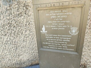 A few kilometres from the Great Synagogue, in Ramat Gan, the first elementary school in the city was used for similar purposes. Its plaque says that the place was used by the Etzel during the 1930s and 1940s for weapons training and as a secret arms cache.