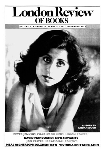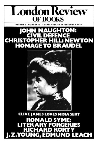 ‘In this unique fiction,’ say the publishers, ‘word and image meet with a richness scarcely seen since Blake.’ Certainly A Humument is no ordinary novel: but nor is it much like Blake’s engravings, ‘Word and image’ meet in these pages more as they do in a comic strip – in particular, the comic strip as it has entered Pop Art – or as in the single words of type in a Cubist painting. Tom Phillips is a painter who has exhibited earlier versions of these pages as a form of Gesamtkunstwerk, with the Coleridgean aim of ‘keeping the greatest number of things suspended in a unity’. In the past, he has also used other material such as picture-postcards, with the axiom ‘Everything in the world exists to end up as a postcard.’ But everything ends up as a book, in Mallarmé’s original words, and a book comes appropriately from a painter who first found his own voice, in 1965, through ‘chance procedures and the extensive use of texts’. This is what Burroughs and other novelists have been up to. And the sub-text of A Humument’s 367 pages is itself a novel: W.H. Mallock’s A Human Document, in an edition of 1892. Most of this sub-text has disappeared under acrylic gouache, collage or pen and ink, leaving a few islands or isthmuses that stand out to be read as words. If there’s a connection with games played by Max Beerbohm and Joe Orton in ‘treating’ a printed text, A Humument is never merely subversive or facetious, and pictorially is highly effective. There are pages that suggest soil profiles as used by ecologists, or Matisse cut-outs or Pop Art fashions: but brought together in a pocket book they reveal that Mr Phillips has a distinct and pleasant voice of his own.