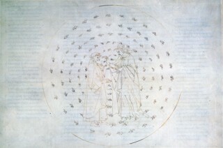 The work for Canto xxxii of the Paradise is incomplete, leaving the Queen of Heaven, Christ and Gabriel stranded on the rim of a monumental blank which would have been the Celestial Rose. They are diminutive figures in a daunting emptiness created by large-scale erasures: proof that the Empyrean is beyond depiction or description. As for the preceding Canto, there is nothing at all. Botticelli took the parchment set aside for this illustration and bore it straight to Hell. It was used for the lower half of a double-spread figure of Lucifer, in which Dante and Virgil clamber out of the Inferno (xxxiv, 2). At the groin of the huge, shaggy figure – the centre of the earth – down becomes up, as they turn through 180 degrees in order to emerge head first in the southern hemisphere.