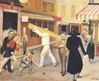 Having moved into a large Paris studio in 1932, Balthus realised that he had the room to enlarge a view of the city that he had painted several years earlier, and to make it as disciplined, indeed as monumental, as a composition by Masaccio or Piero. The edges of forms in The Street were sharpened and the receding lines of pavement, shop windows and striped awnings emphasised, making the picture more artificial, more stagey. Other strong diagonals, notably a builder’s plank, are placed parallel with the picture plane, creating a tension with the receding lines. The colours in the background are matched with those in the foreground, so there is no aerial equivalent to the linear perspective. On this taut, busy set, pedestrians move with puppet-like stiffness. Only one figure relates to, or rather collides with, another: the young man in black who assaults the schoolgirl in white ankle-socks (his gesture was made less obviously indecent by the artist at the request of the owner, James Thrall Soby).