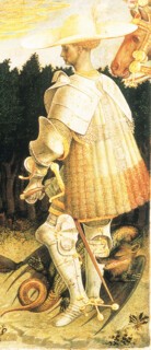 Pisanello, the subject of an exhibition which can be seen until 13 January at the National Gallery, was admired above any of his contemporaries in the 15th-century Italian Courts, and much praised and patronised. He was, by any definition, fashionable, a man who both made and recorded fashionable things. The exhibition includes a remarkable proportion of his surviving work: the drawings document the efforts of embroiderers, tailors, furriers, hatters, armourers, hawkers, huntsmen, dog breeders, harness makers and horse copers – the makers or minders of gear for the princely pastimes of choice. There are even a few bits of real armour which show how accurate he was. The princes themselves are here, too: in portraits on medals and in paintings of Leonello d’Este and (probably) his wife Margherita Gonzaga, a picture which is, we’re told, the first Italian profile portrait of a woman. She sits composedly, if not exactly decorously (there is, in her look, a suggestion of the cheerful, self-willed schoolgirl) in front of a background of dark foliage dotted with pinks, columbines and butterflies. There are preparatory drawings for scenes of romantic chivalry: one of the now sadly battered frescos in the series illustrating Arthurian legends which he painted in the Palazzo Ducale in Mantua has been blown up as a wall covering. Even his St George (shown here), who wears a broad-brimmed straw hat and fine armour, and his St Eustace, in a fur-edged gold coat, are dressed in high fashion.