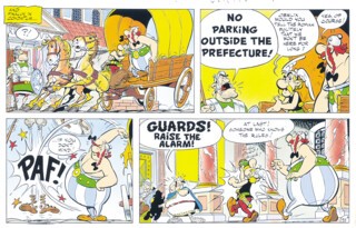 Most critics, on the other hand, have thought that there was a good deal that needed explaining. Some, like the Italian interviewer, have dwelt on the appeal of the David-and-Goliath conflict between the Gauls and the Roman superpower. Or, at least, David and Goliath with a twist: Astérix doesn’t beat brute force by superior cunning and intelligence – he does it thanks to his unexpected access to even bruter force than the enemy can deliver. In adventure after adventure, most of the Gauls’ over-ingenious schemes misfire as badly as the best-laid Roman ones. The reassuring fantasy is that, thanks to the magic potion, Astérix and his friends can mess things up and still win out.