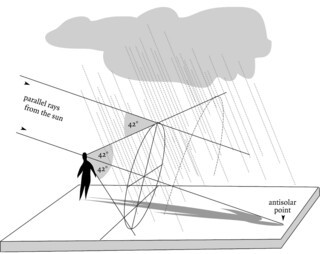 It was Newton who saw that constituent colours of rays of white light entering the drop are variably refracted. The 42° cone from the eye describes the position of raindrops which project the red part of the spectrum. At a slightly smaller angle the eye receives light from the blue end.