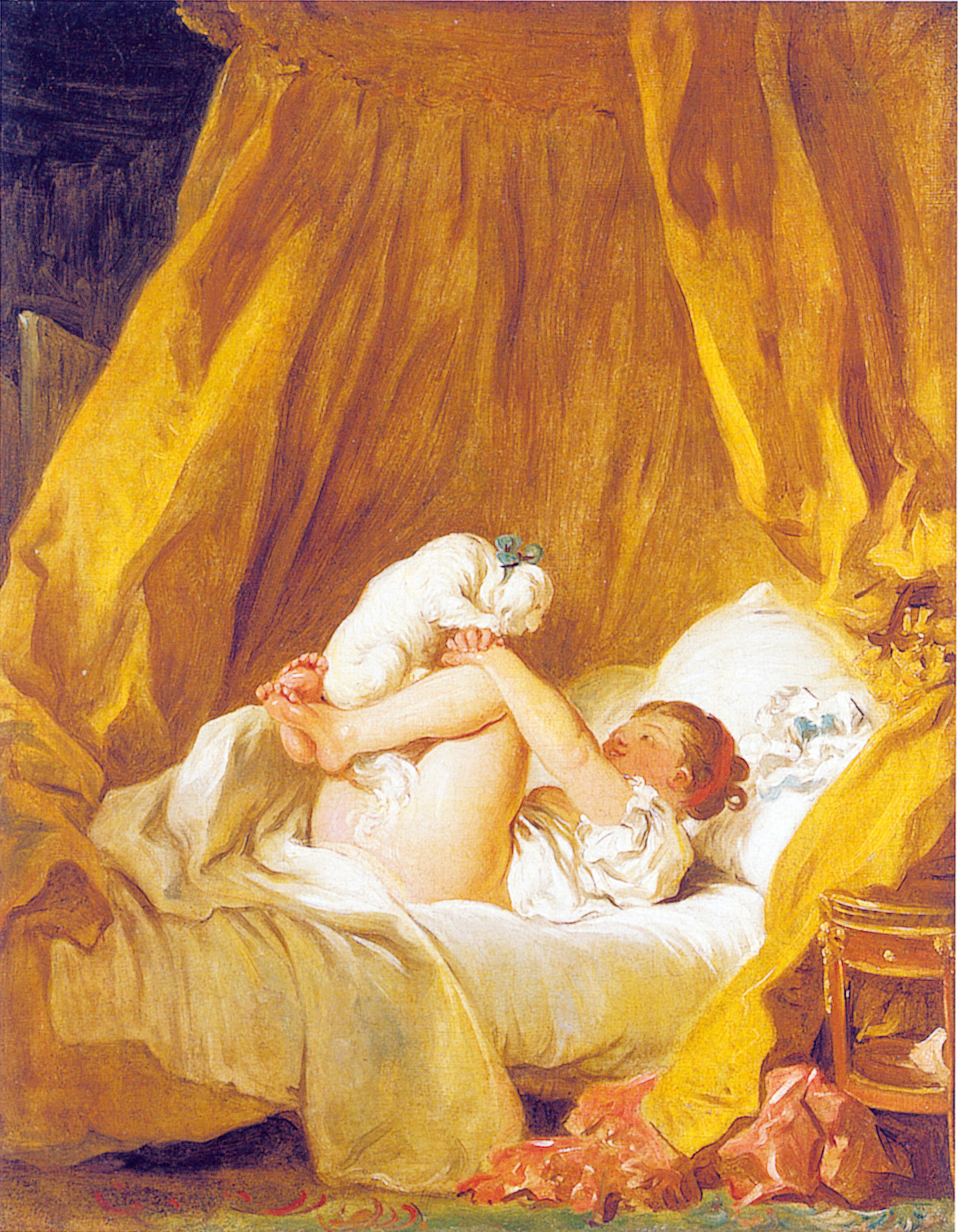 Drapery provides a good opportunity for a one-to-one relationship between brush strokes and the thing represented: the painter is never more free from constraint – and never more in danger of being flash – than when using a single stroke to show the crease in a sleeve or a rumpled twist of bedspread. In Fragonard’s A Young Girl on Her Bed, Making Her Dog Dance it is not just the naughtiness of the subject, but the bustle of the brushwork that makes you smile.