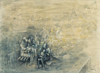 On the day war was declared, Clark went round to the Treasury to ask if he might be allowed to submit plans for a War Artists scheme. His first aim was to save art by putting artists to work and ‘as far as possible to prevent them from being killed’. He got his money and a War Artists Advisory Committee was set up. For the duration Continental Modernism would be on hold. English painting, isolated from foreign influences and competition, would be carried on as war work. Far from stifling expression, sticking to subject-matter that bore some relation to the war seems very often to have been a benefit. It was not surprising that those who already had reputations as illust-rators fitted in: that Bawden’s Edward-Lear-like quirks suited the job of recording Commonwealth troops and camp life in the countries Lear himself had travelled through; or that Eric Ravilious, whose ability to build pale order out of ordinary things made him the Piero della Francesca of the cornershop and the provincial high street, was able to catch a military sickbay’s combination of bleak and neat, or make the inside of a submarine as ordered as a perspective view of an ideal town. But that Moore should find a source for poses and images of unsentimental solemnity in the sleepers who lined the platforms of the London Underground, and Nash the stuff of still lifes imbued with enigmatic melancholy in the sun-struck remains of downed German aeroplanes, was less predictable.