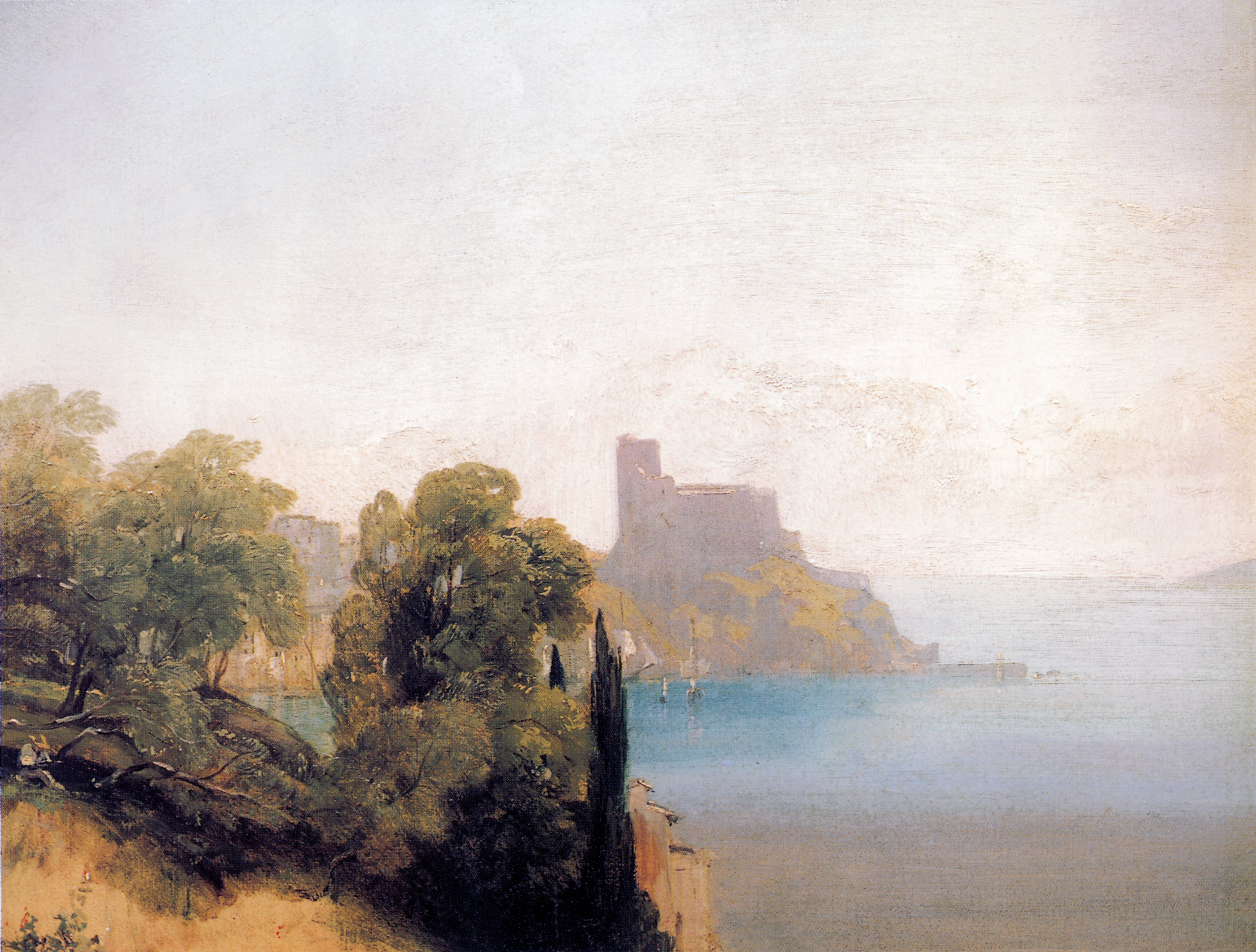But the exhibition’s central narrative has to do with styles: borrowed and jointly developed, on the one hand, becoming old-fashioned, on the other. The brightness, matched by fresh colour and handling, in Constable’s White Horse made Salon studio landscapes look laboured. Bonington’s talent for the economical transcription of flat landscapes, high skies and water was an advance in technique which brought something of the directness, and the pale palette, of watercolour to oil painting. His Lerici (c.1828) is shown above. This directness, allied to the mundane subject matter which it suited – Bonington’s coasts and fishing boats, Alexandre-Gabriel Decamps’s hunting scenes – could seem a betrayal of the pursuit of beauty (a conservative critic said he would prefer a badly painted Bay of Naples to a pile of pike, no matter how finely done). But imagined places and events and high themes were on the way out.