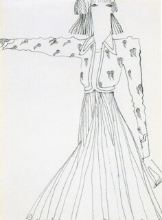 As a boy Clark buried himself in copies of Vogue from the 1930s and 1940s. In them there were fashion illustrations which made it easier than photographs do to see what clothes might look like in the real world. They showed women wearing them on trains, on boats, in drawing-rooms. Photographers and models, having to give glamour to lens-rendered reality, need more extreme poses and more striking contrasts to bring home a point. While illustrators made garments look good by explaining the meaning of a seam, the swing of a skirt or the drop of a hat brim with a line which had something of the individuality of handwriting about it, photographers have to make the point by doing something balletic with the body. Fashion drawing is different from fashion illustration of that classic kind. When Clark and Birtwell drew and drew, filling sketchbooks and developing ideas, they were not making fashion illustrations: they were playing with ideas for making clothes in the way architects play with ideas for plans and elevations. Fashion illustrations are to fashion drawings what architects’ sketches are to presentation drawings of buildings in perspective.