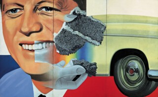 Yet not all is well. Kennedy appears flushed (a blood red also appears in the ground of the painting and in the hub of the car), and the female fingers protrude, grotesquely, out of his head. All the promises are for sale only, and the goods are near or past expiration: the cake is grey, beyond stale, and the car, a 1949 Chevrolet, is a faded desire. A glance at the date of the painting – 1960-61/1964 – reveals that its making straddled the JFK assassination, forty years ago last month. Suddenly the dream – and it is a collective dream that Rosenquist, a sign-painter from the Midwest, presents here, right down to its broken rebus logic – becomes dark: the sedan suggests the fateful limousine in Dallas, the cake fragments evoke the exploded brains of the President and the headshot turns into a bad joke. Of course the Kennedy myth crumbled a long time ago; the extraordinary thing is that Rosenquist could paint the myth yet point to its failure, and do so in the original moment.