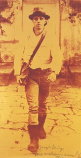 Political stories and arguments underlie another kind of work, the real events he set up and participated in. These ‘Actions’ were by their nature ephemeral; they could be recorded, but not possessed. The most famous of them, I Like America and America Likes Me, was carried out in 1974 (it was recorded; a video is on view in the exhibition). Beuys flew to America, had himself unloaded from his plane wrapped in felt and transferred by ambulance to a gallery. He was put in a room with a coyote. Fifty new copies of the Wall Street Journal were delivered each day; the coyote urinated on them. Beuys, sometimes wrapped in a felt blanket, sometimes making gestures with his walking stick, always wearing gloves, his trademark felt hat and fisherman’s vest, had an uneasy relationship with the animal, which showed a range of behaviour from aggressive to canine-companionable. The Action was resolved after some days when Beuys, having set foot on no American soil except the floor of his gallery/cage, was rewrapped and delivered back to the airport. In this work, Beuys explained, he was addressing contemporary scandals – the Vietnam War – and ancient ones: the treatment of native peoples to whom the coyote was sacred.