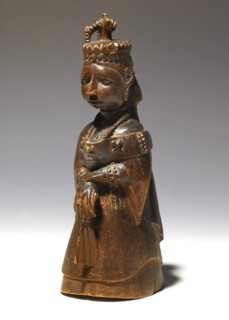 In the 20th century there was a market for local carving among colonial expatriates. A Yoruba piece from the 1940s of a European official, complete with pith helmet and fly whisk, flanked by African policemen, all three figures mounted on a wheeled cart, is cruder than some of the earlier pieces; it’s a bold, lively sculpture which could also be a toy. You feel that the carver has the measure of the colonial official. Is there an element of caricature? I don’t think so, but the more awareness the artist shows of the subject the more difficult it is to be sure of his attitude towards it.
