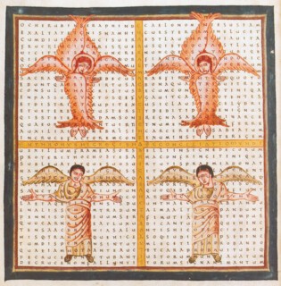 Textual engineering has its own aesthetic, and anyone who starts the day with a crossword or a Sudoku puzzle will have an inkling of the pleasure scribes must have had in orchestrating the layered meanings of manuscripts like the Triple Psalter, or in creating the ingenious form of Hraban Maur’s poem in praise of the Holy Cross, in which the text, all in capitals, is laid out in a cruciform array.