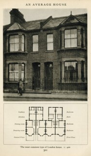 we see interminable rows of these swarthy little houses with all their protruding little kitchen wings. It is the most compact imaginable for a street house. The light in the rooms facing the yard is but spare, but the whole house is comparatively low. Also, as regards the front, the buildings from the end of the 19th century differ from those of the beginning. In order to use the narrow site each of these small houses has got a bay, and the brickwork is decorated with ornamented concrete details, columns, lintels and other trumpery. This typical house, built for people of the lower classes, contains two living rooms and kitchen on the ground floor and on the first floor three bedrooms and bathroom. These are the requirements of an average London house.