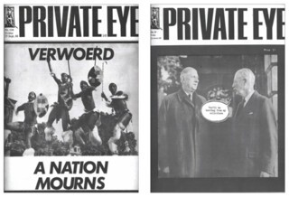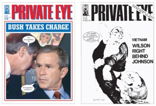 The main feature of Private Eye: The First Fifty Years, at the V&A until 8 January, is a large wall plastered with the magazine’s covers. A monumental celebration, on a grand scale, of a scruffy little rag whose production values, to this day, owe much to its memorable antecedent, the British Railways lavatory roll. It’s a good thing that only one of them has lived to tell the tale. And a pleasure to see the Eye crowing over its longevity and many narrow escapes – several fools and villains have tried to kick it off the dung-heap and wring its neck. But, as the covers on this wall of fame remind us, fools and villains are the lifeblood of the paper. Every reader has a cherished bubble photo, from Wilson and Biafra through Kissinger in South Africa (HK to Vorster: ‘I’m only here for De Beers’) via James Goldsmith, Robert Maxwell, Rupert Murdoch, to Mugabe, Bush and Blair. For fans of a pensionable age, Verwoerd’s assassination (‘A Nation Mourns’, 17 September 1966) is a star cover. Younger readers may prefer a ghoulish photo of Norman Tebbit, the Tories’ ‘New Caring Face’ in 1986, and his prince-of-darkness bubble: ‘I can’t speak to you now. The sun’s coming up.’ But if a long-lost favourite is not on view at the exhibition, it can be found again on the Eye’s website, in the covers library.