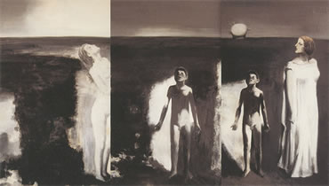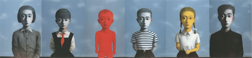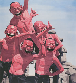 The other thread in this, the penultimate phase of the story, is Cynical Realism, which peaked about six years after Tiananmen but hasn’t yet had its day. More prized by foreign investors than the Popists, the Cynical Realists are clever and captivating, standoffish and garish by turns. Their disenchantment with politics is matched by their reservations about apolitical consumerism, an uneasiness which speaks to our own sense of gratified ambivalence and makes them some of the richest artists on earth, whose work we’d recognise as easily as Wang Guangyi’s even if we couldn’t put a name to it: Yue Minjun, Zhang Xiaogang and Zeng Fanzhi are well represented in this exhibition (see below).
