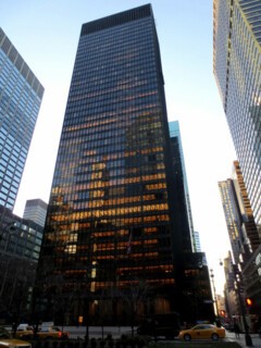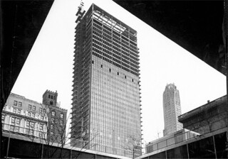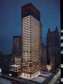 Wright had wanted the Seagram commission, but Lambert distrusted his sense of entitlement, and to her credit ignored his criticisms of Mies. She writes about the final building, a totem of capitalism, almost as if it were one of the wonders of the world. Her account captures some of the excitement one feels when one approaches the slender tower for the first time.♪ Mies gave over half of the site to a dramatic public plaza, a kind of forest clearing in the middle of the urban jungle.17 From street level, you climb up some stairs to a podium of pink granite, into which are cut step-rimmed pools, flanked by ginkgo trees and huge benches of deep green marble. As you approach, the neo-Florentine Racquet and Tennis Club opposite is reflected in a 24-foot-high screen of glass, adding to the sense of updated, refined classicism. The pink granite continues into the lobby, creating an impression of seamless progress, the elevator shafts hidden behind massive travertine panels. The svelte column, its steel trimmed in deep-brown bronze, rises over you with tremendous force: the overall effect is of discreet power.[watch]