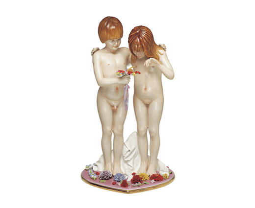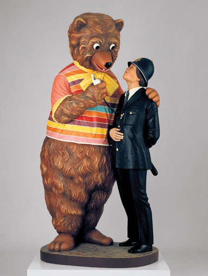 Consider the porcelain boy and girl of Naked (1988). Rather than an Edenic purity, these pre-pubescent twins evoke a nasty prurience; they also gaze into an abundant flower that looks as though it might hold a dark Bataillean secret about the true nature of sexual organs. Koons makes his animals even more polymorphously perverse (based on toys and curios, they are creepily semi-human to begin with). Take Rabbit again. The bunny is an infantile thing, but it is also an adult symbol of rampant sex, and this one is erect in all its bulbous parts; Koons refers to it as ‘The Great Masturbator’ after a 1929 painting by Dalí. Or take Balloon Dog (1994-2000), which at first appears as innocent as its birthday-party inspiration. ‘But at the same time,’ as Koons says, ‘it’s a Trojan horse. There are other things here that are inside: maybe the sexuality of the piece.’ And after a while it does begin to look like a poupée by Hans Bellmer reworked for a super-rich kid. Edgier still is the sexuality suggested in Bear and Policeman (1988), a polychromed wood piece that shows a big cartoonish bear in a childish striped shirt looking down on a boyish bobby (whose whistle the bear is about to blow), and in Michael Jackson and Bubbles (also 1988), a well known porcelain piece that shows the King of Pop cuddling with his pet chimp (Koons predicts a whitened Jackson here). The two sculptures point to an illicit love that crosses not only generations but also species, and Bear and Policeman implies a further joke about English pop culture (the juvenile bobby) being schooled by the bigger, badder American version (the papa bear).