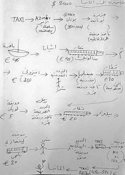 A Kurdish friend of mine in Sulaymaniyah in northern Iraq recently posted an image of a hand-drawn diagram on his Facebook page. With little arrows and stick figures and pictures of a train and boat or two, the diagram shows how to get from Turkey to the German border in twenty easy steps. After you’ve made the thousand-mile trip to western Turkey, the journey proper begins with a taxi to Izmir on the coast. An arrow points to the next stage: a boat across the Aegean to ‘a Greek island’, costing between €950 and €1200. Another boat takes you to Athens. A train – looking like a mangled caterpillar – leads to Thessaloniki. Walking, buses and two more worm-like trains take you across Macedonia to Skopje, and then through Serbia to Belgrade. A stick figure walks across the border into Hungary near the city of Szeged. Then it’s on to Budapest by taxi, and another taxi across the whole of Austria. At the bottom of the page a little blue stick figure is jumping in the air waving a flag. He has arrived in Germany, saying hello to Munich, after a journey of some three thousand miles, taking perhaps three weeks, at a total cost of $2400.