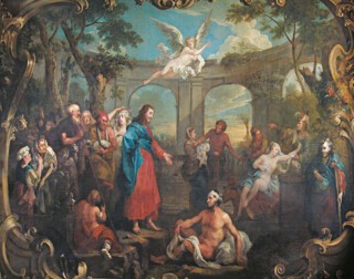 Barry believed that true art was made not by ‘paddling in whatever is ridiculous, faulty, and vicious in life’ but ‘in the constant pursuit of all that gives a value and a dignity to human nature’ – the pursuit, in short, of history painting in the grand style, the highest of the genres of high art, which he himself pursued, but which few other artists in Britain, so he believed, had a taste sufficiently elevated to attempt. By his mid-career, Hogarth had become thoroughly impatient with all the ‘puffing’ and ‘pother’ made about the grand style, and irritated too by the suggestion that he could aim no higher than the ‘modern moral subjects’ which, in Joseph Andrews, Fielding would praise as ‘comic history painting’, as if Hogarth was doomed by a low taste and confined ability to be merely Hogarthian. The grand style, Hogarth believed, was ‘more easily attainable than is imagined’. When the governors of St Bartholomew’s Hospital determined that their new staircase should be decorated with history paintings, Hogarth won the commission by offering to do the job for nothing, and, ‘with a smile at my own temerity’, produced two ambitious pictures of appropriate subjects: The Good Samaritan, depicted pouring oil and wine into the wounds of the traveller from Jerusalem, and The Pool of Bethesda, in which Jesus tells a lame man to take up his bed and walk.