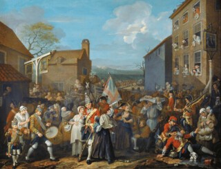 Depending on which source you believe, George II was either fascinated or appalled by the painting. ‘Pray,’ he is said to have asked a nobleman in waiting – and if he did, he revealed himself as still to be fully acculturated in his kingdom of England – ‘who is this Hogarth?’ ‘A painter, my liege.’ ‘I hate bainting, and boetry too! Neither the one nor the other ever did any good! Does the fellow mean to laugh at my guards?’ ‘The picture, an please your majesty, must undoubtedly be considered as burlesque.’ ‘What! A bainter burlesque a soldier? He deserves to be picketed for his insolence! Take his trumpery out of my sight.’