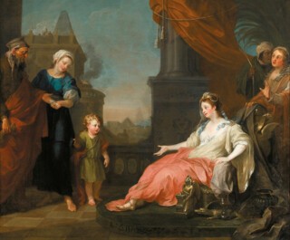 Pharaoh’s daughter, a woman of gentle beauty, makes herself as welcoming as possible, extending a kindly hand and leaning back in her chair in a pose that would look languid in some contexts, but here seems to suggest a desire to make herself as unthreateningly small as possible. Einberg remarks that she may be modelled on the Countess of Pembroke, ‘an active patron of the Foundling Hospital’, and if so, it would be appropriate to an effort by Hogarth to emulate the great painters of the Italian Renaissance, who often painted portraits of their patrons as actors in biblical events.