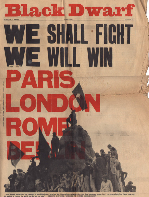 So that’s how it happened, and we raised money for a broadsheet, the first broadsheet on Mayday 1968, and people poured in with offers of help. When I think back on it, it was quite unusual: first, you had the poets, you had David Mercer, who really did help a great deal; behind the scenes, there were people working for the BBC who couldn’t be public, but we can name them now – Ken Trodd, Ken Loach, Tony Garnett, John McGrath. You know, from the cultural milieu. There was Clive, Fred Halliday, later Sheila Rowbotham got involved, and Roger Smith, script editor at the BBC. The French May erupted as we were about to launch the first issue, which had come out looking slightly miserabilist and unimaginative. It was generally felt that the cover was awful. We voted to pulp it and D.A.N. Jones, later of the LRB, walked out. We’d lost the editor. I was asked to take over and with designer Robin Fior looking over my shoulder I wrote: we shall fight, we will win: Paris, London, Rome, Berlin. The vote was unanimous. We were for Utopia. To raise money, we would have to get hold of people who by our standards were very wealthy: David Hockney, Ron Kitaj, Feliks Topolski, and other painters, who said: ‘Well … we’re a bit short of funds, but here, have a painting.’ And if we’d kept those paintings, we could now have launched six magazines; but auctions were held, and the money was put into the Black Dwarf – and lots of people liked the flavour of it.