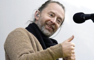Thom Yorke is holding the microphone out to a crowd singing the chorus of ‘Creep’ in blunt unison, never missing a word. He shrugs. The tilt of his wrist says, look at these idiots, and maybe, I am an idiot myself. Then he smiles, one cheek lifting into an apple in the grey fog, and it is a real smile trying to pretend it isn’t. He begins to sing the final flight of notes, at first almost parodically, but then halfway through his voice bursts some constraint of bitterness and flowers into the real song, as big and as terrible as a tiger lily, and he has made it new, and it is his again. It defeats even the men calling out his name, on the verge of heckling, trying to steal him from himself, Thom, Thom, Thom. His skin is gone, he is utterly protected, he is the size of the arena and alone as he was when he first discovered he had that sound inside him. He stands, squeezing the microphone as if it were the throat of what had hurt him, the rigid systems inside him blown, nothing more than a boy, wearing the only kind of shirt available at that time.