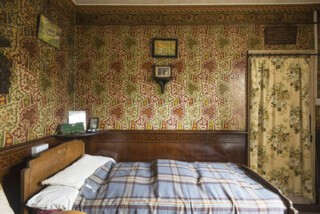 In some rooms the curators have reinstalled Bakelite switches for an authentic early-century look – but elsewhere the later white plastic remains. Upstairs there is more brown paint on the woodwork. In the small back bedroom hang sheets of canvas that Parr never got round to painting on. Further along the corridor, the walls of the main bedroom are an Arts and Crafts marvel with a pattern of red and green-edged leaves on red and green stalks and an ornate painted wooden ceiling. Elsie’s floral dresses hang neatly in the fitted wardrobe. A nice 1970s light pull hangs over the middle of the bed.