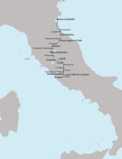 Initially, Garibaldi had imagined they might find a town where they could raise the tricolour of Italian independence and defend it against all comers. Todi, he thought, might be the place: eighty miles north of Rome, dramatically isolated on a steep hill, stoutly walled. As elsewhere, a band played to greet his men. But the town’s leaders had no stomach for a fight. They didn’t want their homes and churches razed to the ground. The Austrians were close by to the north. The French were approaching from the south. Garibaldi didn’t insist. In another unexpected move, he travelled west over the high plateau to Orvieto, arriving just in time to eat the plentiful rations that the French had ordered in advance, then leaving the town travelling north, just as the French marched through the gate on the other side. He knew they couldn’t follow him into Tuscany, which was under Austrian control.