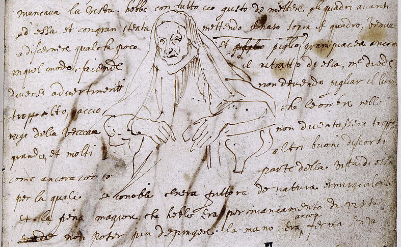 In July 1624, two artists met in Palermo during an outbreak of plague which killed thousands of people, including the city’s ruler. The younger artist, Anthony Van Dyck, made a quick pen and ink drawing and wrote down his impressions of Sofonisba Anguissola, then apparently 96 years old and almost blind. He was struck by her intellectual curiosity, her politeness and good manners, and her continuing passion for paintings: