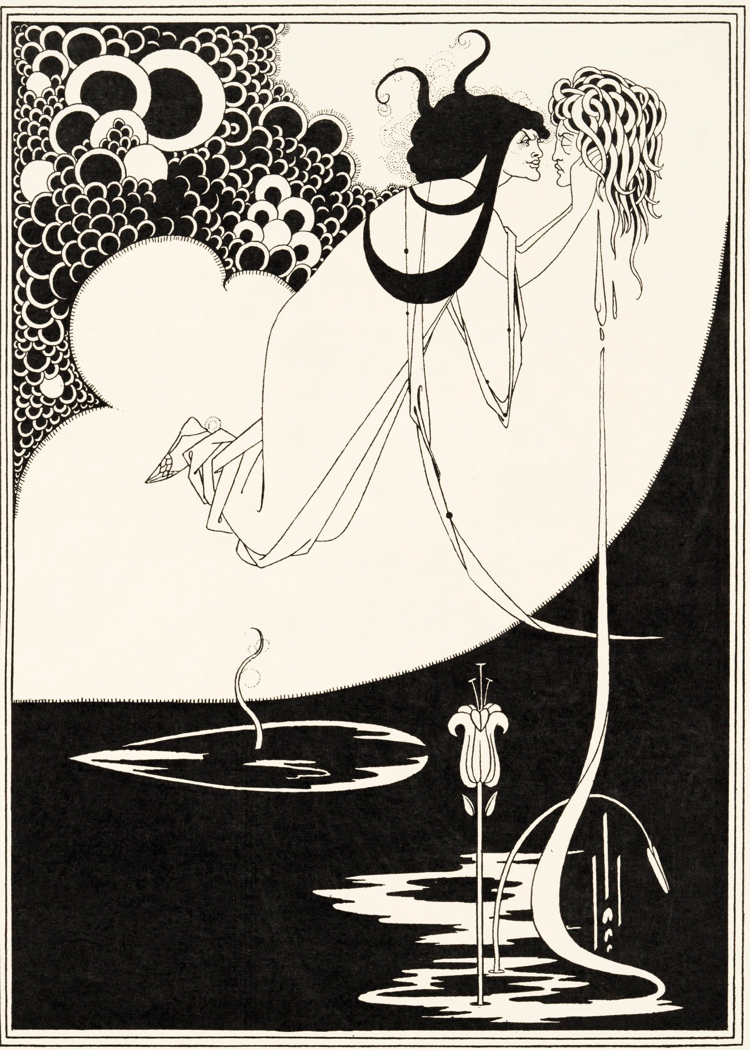 For an artist so possessed by sex, the part it played in his own life remains surprisingly unclear. There was talk of mistresses and a rumour of incest with his sister, to whom he was very close, but for which there is no evidence. Insofar as he bothered to defend himself from allegations of obscenity, Beardsley merely claimed that his drawings were ‘anatomically correct’, reiterating that he drew only what he saw, even if ‘I see everything in a grotesque way.’ Perhaps his physical frailty made him feel like an outsider, an amused or satirical observer of sex. Barlow’s essay is titled ‘Beardsley’s “Obscene Drawings”’, inverted commas presumably meant to distance her from the prudishness of the 19th century, but ‘obscene’ is probably the best word: they are certainly not ‘erotic’. These are scenes of constant titillation, voyeurism and frustration in which desire is torment, there is little sign of pleasure and consummation comes only, in Salome, with death. The Climax shows Salome holding up the severed head of John the Baptist to look him in the eyes, beside the lines: ‘J’ai baisé ta bouche Iokanaan/J’ai baisé ta bouche.’ Below and between the two a phallic lily rises. The Art Journal found Beardsley’s work upsetting, ‘terrible in its weirdness’, full of ‘horror and wickedness’. His reputation was made.
