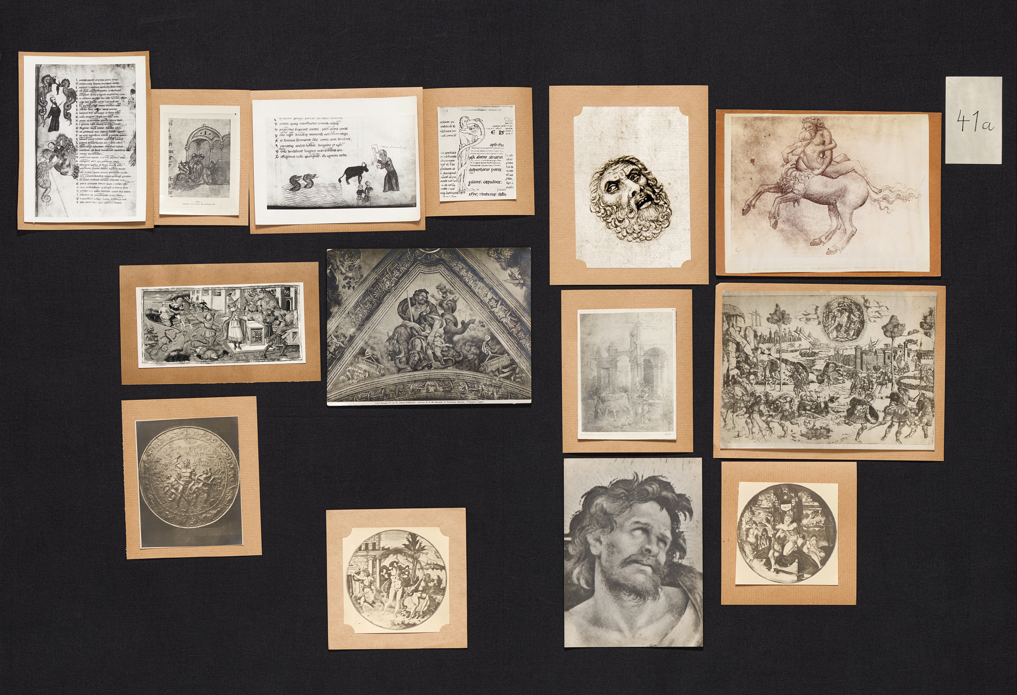 In the four years before his death in 1929, Warburg shuffled these images back and forth across the boards, using them for lectures and for research – a sort of workshop or laboratory in which he was able to illustrate different progressions of thought. His eccentric methods were well documented by his assistant, Fritz Saxl, who described the way Warburg’s research was animated by the handling of images and their visual display; he constantly rearranged his books, too, creating possible paths of conjecture. Each new idea would call for the collecting and ordering of relevant volumes. He kept his personal notes in card boxes, Zettelkästen, and constantly reshuffled these as well, spreading them out across a table. Exceptional importance was attached to the placement of objects on his desk, as if it were a map of the cosmos.