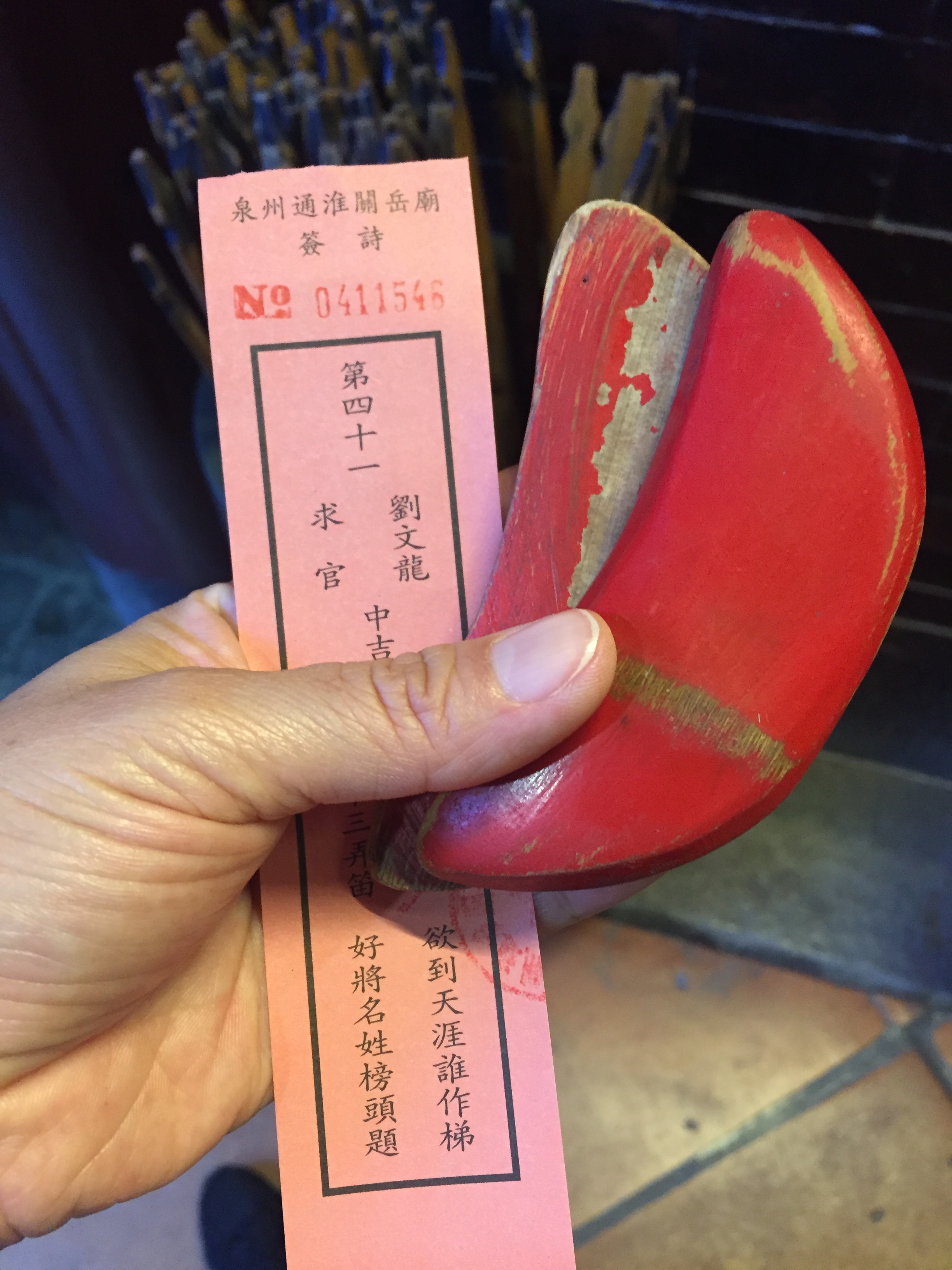 It wasn’t necessarily ‘my’ stick yet. I needed the god’s confirmation. I took a pair of small pieces of wood, about the same size and shape as the two halves of a mooncake. One side was convex (Yang); the other side flat (Yin). Holding the pieces in my palms and asking the god to instruct me, I threw them on the ground. Both landed with the Yang side facing up. This meant the god was still undecided. I threw them again and this time both were flat, which meant the god did not approve of my bamboo stick. I returned it to the barrel and stirred the sticks again. This time a stick with the number 41 jumped out. Back in front of the god, I threw the pieces on the ground again. They landed with a jingle, one Yin side facing up, one Yang. The god had confirmed that the bamboo stick with the number 41 was intended for me.