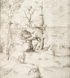 The more one looks at the ink revision, the deeper one’s uncertainty about tone. That Hell is replaced in the drawing by Flemish countryside only floats everything further into the unknown. ‘Landscape’ is a thoroughly modern mode in 1500, especially done in this open-ended sketchbook way; and Bosch’s attitude to all things modern lies at the heart of his strangeness. (If we take the drawing to date from the first years of the 16th century, maybe as late as 1510, then it is tempting, looking at the heron and the gnarled tree stump, to see Bosch nodding ironically to the latest informalities from Venice.) Maybe one thing the landscape setting is meant to do is to put Tree Man, and us, nowhere in particular – adrift on a commonplace arm of the sea. That would go with the Man’s peculiar unplaceable expression. Experts tell us to trust the odd, slightly crude lineation of mouth and eyes: they tally with Bosch’s treatment of certain faces in his unrestored paintings. And the lines pull the Man’s face away from the painted version’s … what? Is it some kind of appeal for sympathy? Or baffled wonder? Or even a philosophical smile?