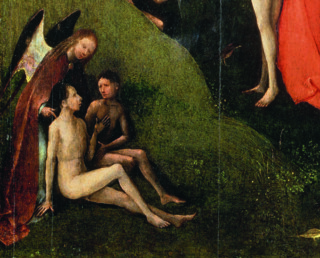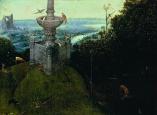 Compare Terrestrial Paradise with a painting on the same subject by Dieric Bouts. It is a fair comparison: the Bouts seems to have been one wing of a Last Judgment done for a church in Louvain in 1468, and Louvain is sixty miles south of Bosch’s hometown, ’s-Hertogenbosch: Bosch could well have seen the Bouts in situ. The painting would already have seemed a little old-fashioned by the time Bosch recollected it – let’s assume Bosch’s Paradise was painted in the very early years of the 16th century – but he would certainly have admired its treatment of the subject. You feel sometimes that Bouts is being deliberately cited – in the robed angel seen from behind, the confident male towards the right, the fountain, the birds on the cliff, even (in panel two in Venice) the hole through the clouds to heaven. And no doubt both artists were partly repeating prototypes that have not come down to us.