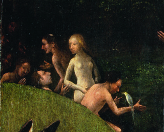 Texture, mechanics – these words, too, are placeholders. When we talk about Bosch’s powers as a painter, it is not only or primarily his ‘touch’ or technique we mean, or even the kind of local astonishment found in the righteous man’s profile. It is just as much the thinking he does in paint about the size of his actors in relation to their surroundings, and the distance at which the actors are set. How far away from us is the man with the tonsure? What is the relation of his height to ours intended to convey? How do we understand the contact and separation between actors in a Bosch-type scene – in Terrestrial Paradise, in the Garden, in his other great gatherings of clans? Bosch’s deepest thinking is directed towards the nature of the group. He is an anthropologist, interested in seeing the way assemblages of minds and bodies are held together – with what degree of permanence or tentativeness, maintaining a fused identity (beneficent or malign) for a moment, but always pulled back towards chaos (beneficent or malign) by inattention, insubordination, tiredness, devilment, the shadow of despair. Maybe it’s no surprise so few of us can follow (or wish to follow) his train of thought on such subjects.