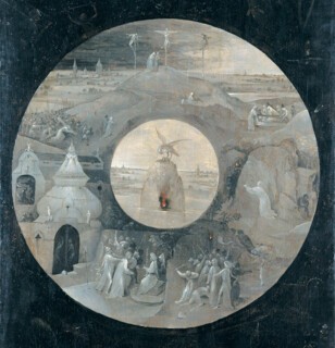 Is there a founding Bosch cosmology? In Berlin, on the back of a large panel showing Saint John on Patmos, Bosch painted a vision of the universe. (There are others in his work: this one strikes me as the most deeply felt.) It is organised in concentric circles. In the innermost ring there’s a mountain with a single touch of fire at its base – the red is almost the sole moment of colour in a great extinguished grisaille. On top of the mountain perches a pelican, shrugging off apocalypse, feeding her four small chicks. Perhaps the flame is blood drawn from her breast. Perhaps – no doubt – she is a figure of the Saviour. But in the panel’s second wheel of fire – the whole despairing world-landscape Bosch puts round the mountain, done in softer grey, with ghostly episodes from Christ’s passion staged among its crags – the Saviour’s sacrifice seems to thin and evaporate. It has become a Mystery Play, a projection, a transparency. The outside edge of its circle is drawn sharp as a knife. The two circles look back at us like the eye – the lens – of a terrible mechanism. Beyond them, darkness … and a scattering of spooks.