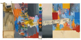 As this art looks at itself, it folds back on itself: it develops by recursion, by ‘repetition and recombination’, as Rothkopf puts it. Johns first juxtaposes motifs within a painting, then often transposes them from picture to picture and medium to medium. Such doubling is intrinsic to printing, which has long occupied him (the retrospective is full – too full – of examples across his career), but it is active from the beginning, in objects (the double ales), in paintings (the double flags), and intrinsically from his early stencilling to his later silkscreening. As Rothkopf notes, Johns plays on the bilateral symmetry of our bodies, mirroring it with paintings divided into left and right halves (the title of the show is Mind/Mirror). Often, too, he uses actual seams, on the horizontal or the vertical, as formal hinges between disjunct panels, which become more complex with the polyptychs of the mid 1960s and later.