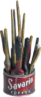 ‘One of the most interesting things one can do is use something in a variety of adaptations,’ Johns commented in 1978, ‘and then ask the question “what does it mean?”’ Sometimes, though, this isn’t so interesting: the iterative becomes repetitive, the recursive hermetic, and as Johns shifts from ‘commonplaces of our environment’ to self-citations in the studio (the word crops up in titles from 1964 on), the work gets too imagistic, too fussy in its fragments, too tasteful in its arrangements – in a word, too involuted (at least for me: I’m an outlier among his devotees on this point). In the process Johns loses his connection to others; by contrast, Rauschenberg and Warhol always address the world, if only by way of references to our shared experience of capitalist junk and glitter. Here ‘sufferance’ takes on the note of arrogance buried in the history of the word: Johns suffers the world to come on to him. Is there a hint of the crown – of the sovereign – already in the Savarin can? It also calls up a fool’s cap, and early on Johns was both king and pawn of a New York art world revved up by a new market. (He knew it too: the bronze Ballantines were said to be provoked by a remark from de Kooning that Leo Castelli could sell anything, even two beer cans.)