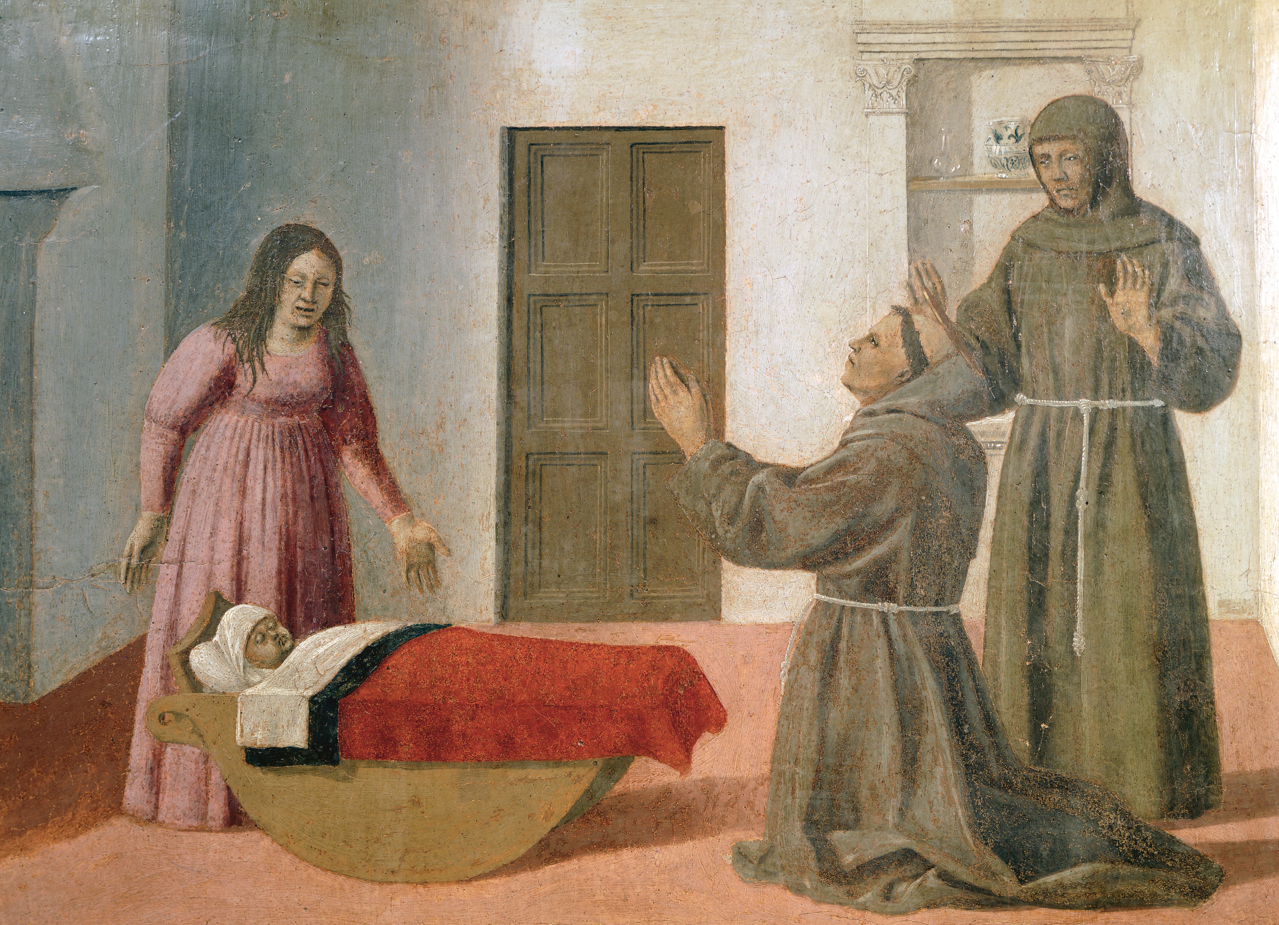 Renaissance frescoes and altarpieces, especially the predella panels of Piero della Francesca’s Polyptych of St Anthony (1460-70), appear to me in their conception and construction to be closer to the world of still life than that of narrative painting. My favourite shows St Anthony resurrecting a child. It measures 36 x 49 cm – modest dimensions not dissimilar to those adopted by the still life artist. The floor could easily be a table, the child’s cot a loaf of bread, the red blanket a dishcloth. I notice the architrave mouldings and the vessel on the shelf that cast shadows and tell us about the direction of light. It is such a subtle lesson in how to handle the problem of the whites. And it is, of course, a still life within a still life.
