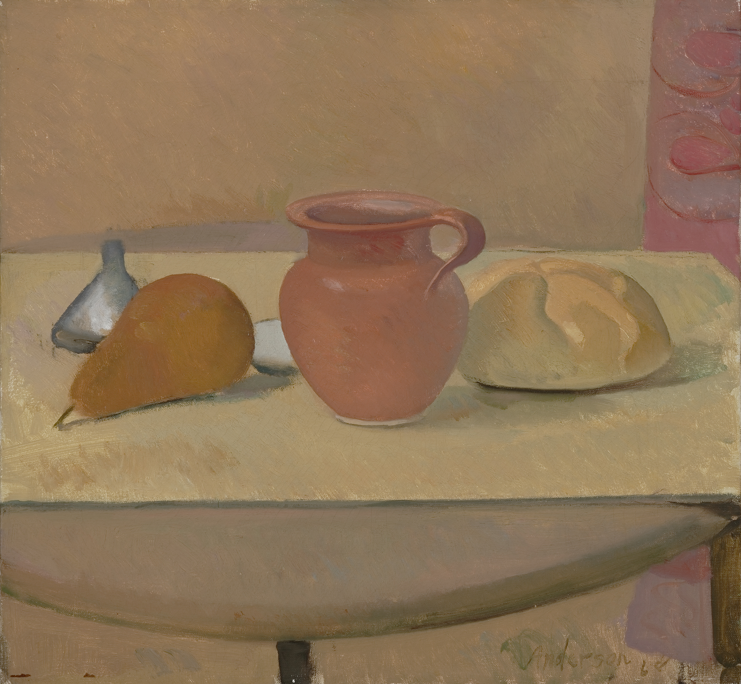 Iam looking at a painting by the American artist Lennart Anderson, a still life from the 1960s. It’s a simple work: five objects arranged on a table top. A loaf of bread, a terracotta jug, a red pear, a funnel and a shape I can’t identify. The painting is a rare achievement of balance and spacing. No two objects are placed in the same relation; every interval is considered. The jug is positioned in the dead centre, but there is a pink strip of vertical cloth on the far right of the canvas to break the symmetry and throw the curve of the table into relief. The colour values are harmonious too, what Anderson called ‘kissing colours’ – values so close that you can ‘hardly tell them from one another, hardly tell them apart’.*