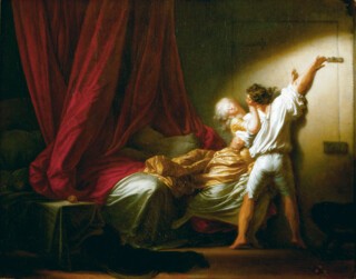 His theory meets its limit in the section on the 18th-century subject par excellence, the kiss, which ends in an analysis of The Bolt. Painted in the late 1770s for the Marquis de Véri, The Bolt was unusual in being famous in Fragonard’s lifetime (it fetched nearly four thousand livres after de Véri’s death in 1785). It shows a couple entangled: the man, having seized his consort with one arm, shuts the bolt on the bedroom door with the other. It isn’t clear whether we are looking at a moment of intense sexual arousal (judging from the disorder of the bed, they may have already engaged in some sexual act) or something more pernicious. Is the woman’s resistance feigned, part of the game of seduction according to the protocols of libertinage, or is her ravishment tantamount to rape?