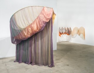 Mayer’s drawings, which open Ways of Attaching, the survey of her work at the Swiss Institute in New York (until 9 January), provided a testing ground for ‘what materials do … & what I can do to them.’ They show laundry pinned to washing lines, elaborate gowns suggestive of stout ghostly figures, the many-headed protuberances of coloured swatches that she stitched and looped together. She called these ‘impossible’ works and described them as ‘a chance to play with colours & all the possibilities of draping, tying, sewing … without $ … unfettered by space and size’. In 1971, the year she started attending consciousness-raising groups, these drawings expanded into three dimensions. She collected material bought cheap from shops on 14th Street, or given to her by a friend who was a lingerie designer, and dyed and redyed it in her bathtub. Then she folded, layered, stretched it over bent rods and tethered it to walls or ceilings so that it might hold empty space within its bulk. Mayer wrote that these works were ‘between painting and sculpture and taking from both’. Her debut show in 1973 at A.I.R. Gallery, the first all-women co-operative art space in New York (she was a founder), consisted of three ethereal textile pieces titled Hroswitha, The Catherines and Galla Placidia. The formidable Galla Placidia dominates the ground floor at the Swiss Institute, where it is shown alongside two other fabric works, Balancing and Hypsipyle. Its gauzy form – two great swathes of colour (peach, yellow, acid green) open out above a curtain of purple – is distinctly human: a headless dignity with enormous sleeves, an apparition in the process of fading away.
