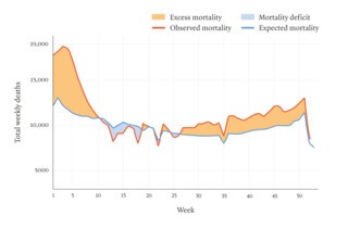 The Human Mortality Database allows users to plot estimates of the weekly totals of excess deaths in England and Wales in 2021. The graph shown here displays excess deaths in orange, and gives some impression of the carnage that followed Johnson’s recklessness and indecision. The Department of Health and Social Care’s own estimate of excess deaths in the first eight weeks of 2021 is 32,733.
