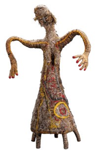 The scene-stealers at the show are the anthropomorphic grass figures of the Seven Sisters assembled by the Tjanpi Desert Weavers. In one room they are suspended from the ceiling, forged forces of grass, branch, raffia, fencing wire, feathers and wool. Their forms change from region to region: in Martu Country, the grass figures have legs; elsewhere they have mermaid tails. In APL Lands, the women are trees, shapeshifting to escape their obsessive pursuer. Wati Nyiru creeps along the ground towards them.